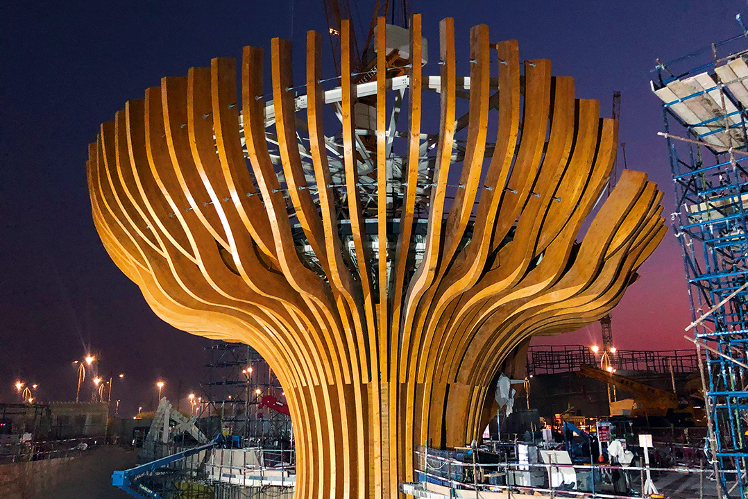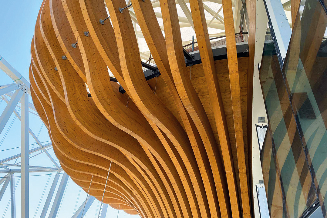 L’albero, escludendo gli elementi che richiamano le radici e il tronco, è composto da tre tipologie di travi curve, che durante la fase di progettazione sono state definite “pinne o fins”: soddisfare il raggio di curvatura dei rami e garantire la migliore resa estetica è stato uno degli obiettivi di questo lavoro. Sono state impiegate lamelle da 15 mm per comporre gli elementi; ognuno di essi è stato ideato, calcolato e prodotto per soddisfare le richieste progettuali, per essere trasportabile dalla sede di Bressanone al cantiere dell’Expo all’interno di container e per essere montato con precisione. Compongono questa struttura un totale di 141 archi con un raggio di curvatura minimo incollato che arriva a 3,00 m.