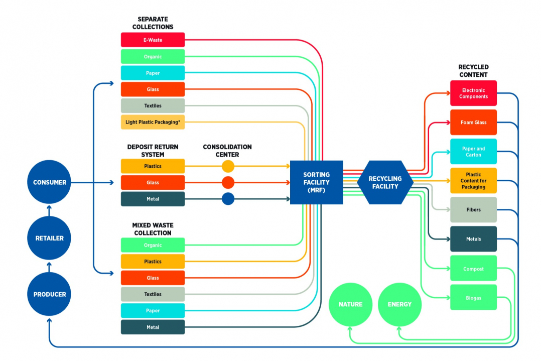 • La selezione dei rifiuti misti (RSU) genera ulteriori tassi di raccolta e riciclo di gran lunga superiori a quelli che gli altri elementi possono fornire. L’incenerimento o la messa in discarica della plastica e di altri materiali ad alto contenuto di CO2 generano inutili emissioni di gas serra. I rifiuti urbani riducono queste emissioni e restituiscono più materiali al sistema per essere integrati in nuovi prodotti. Gli RSU devono essere considerati una priorità d’investimento ora, in quanto sono un sostegno necessario per garantire che i sistemi di gestione dei rifiuti catturino il maggior numero possibile di risorse da riciclare.